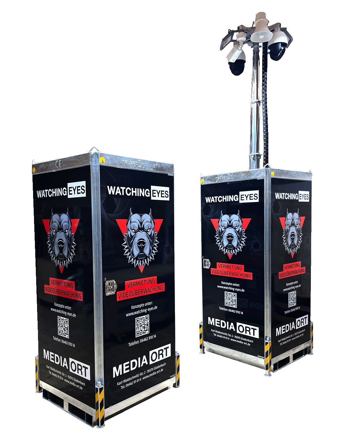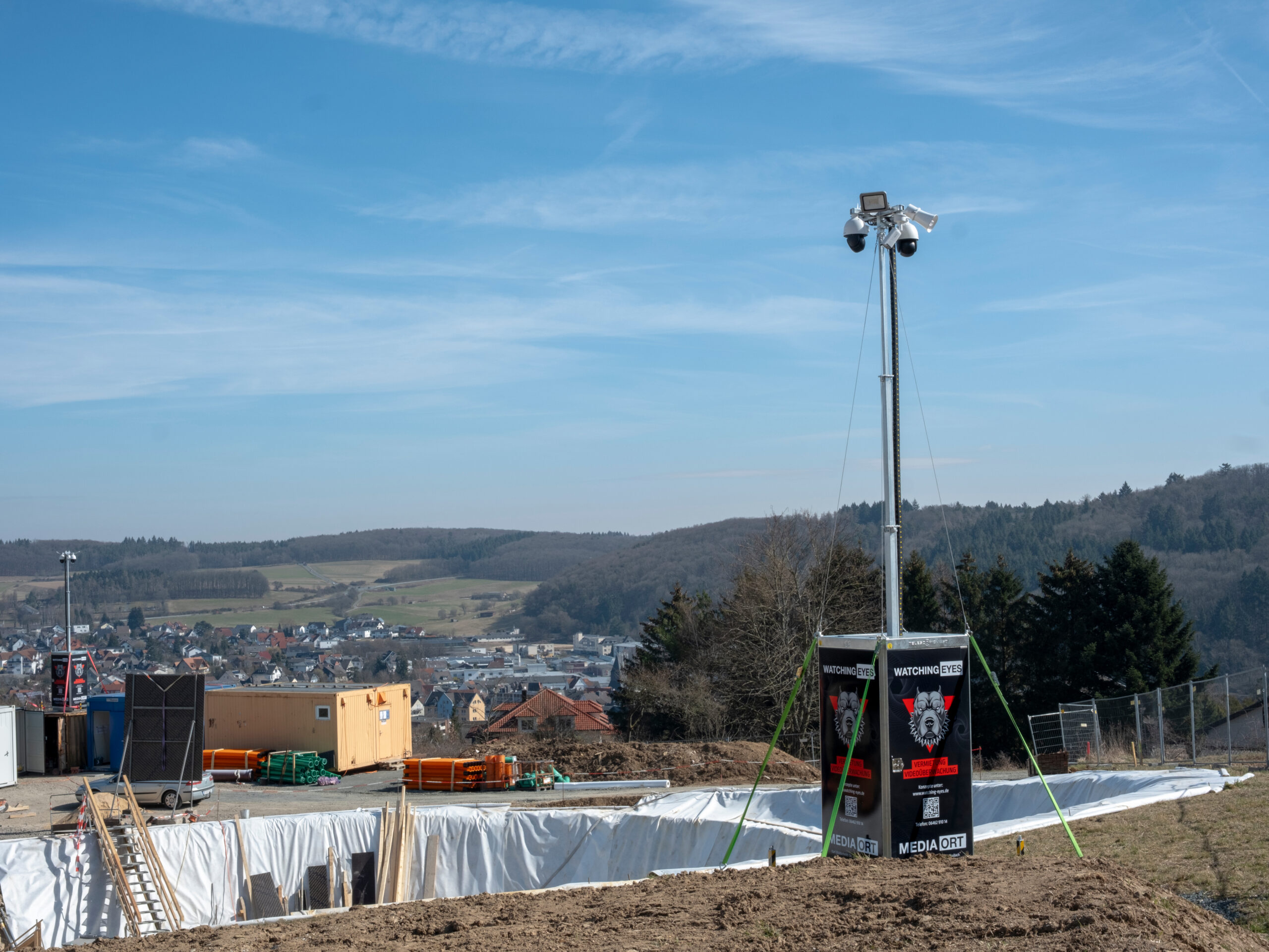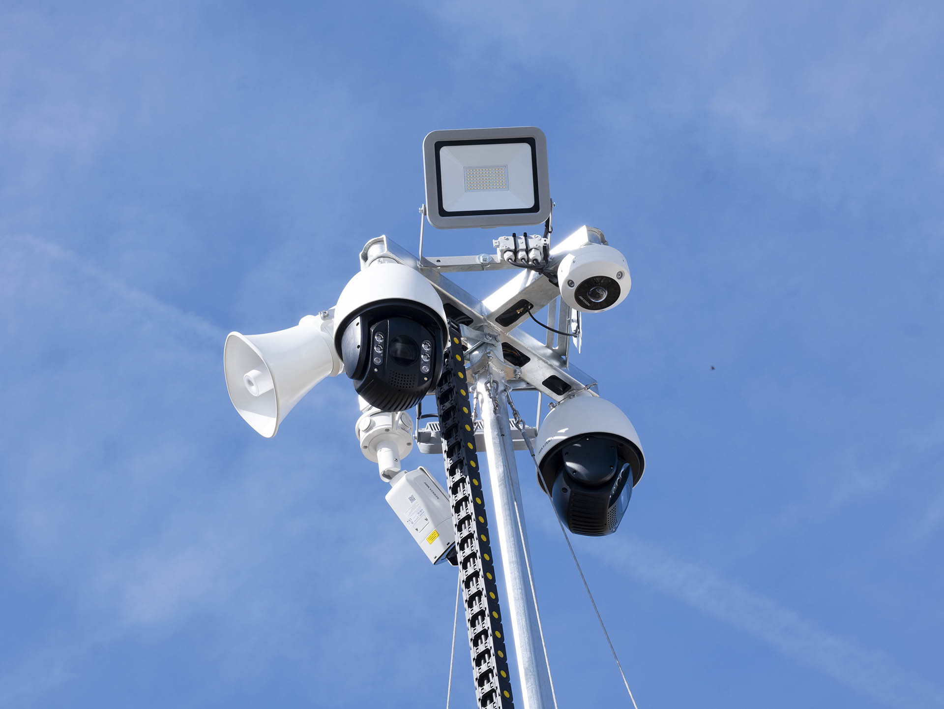6 m hoher Sicherheitsturm mit Live-Ansprache, zwei PTZ-Kameras und einer Thermal Kamera mit Aufschaltung.