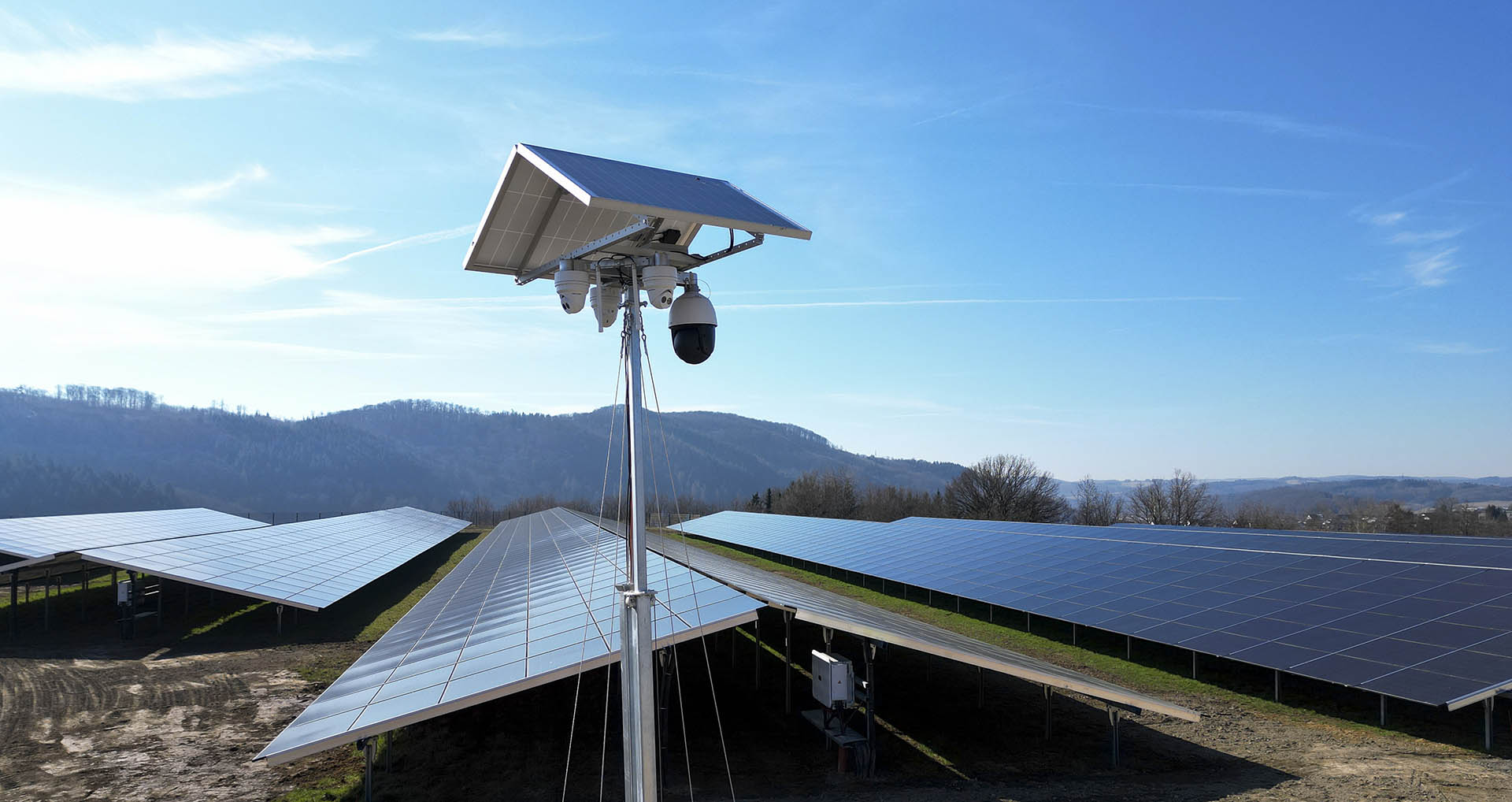 Autarker Turm mit einer PTZ-Kamera und einem 3 Turret Kamera System.